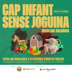 Unió de Pagesos participarà enguany a la campanya de recollida de joguines que impulsa la Creu Roja Joventut. Per aquest motiu el sindicat fa una crida a la seva afiliació, i a la població en general, per a què puguin deixar joguines en qualsevol de les oficines d’Unió de Pagesos-Agroxarxa perquè siguin entregades a infants de famílies en situació de vulnerabilitat. El termini per fer donació és el 22 de desembre.