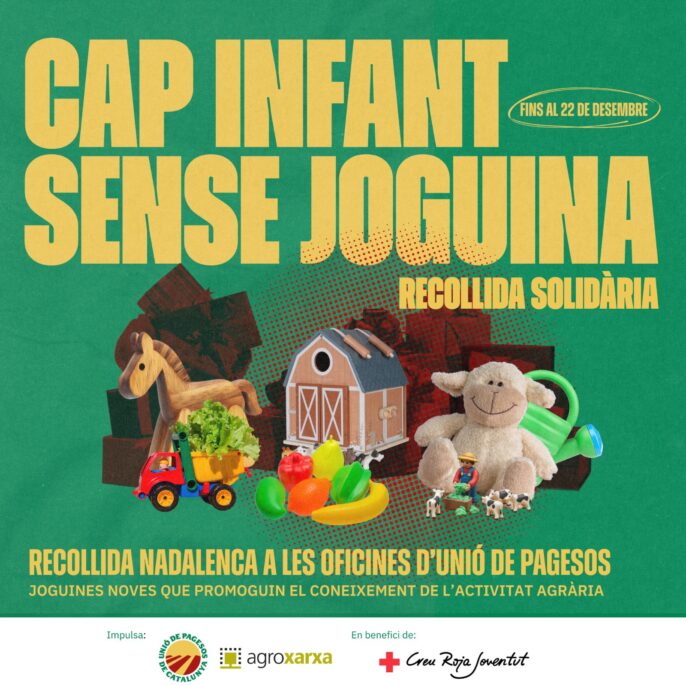 Unió de Pagesos participarà enguany a la campanya de recollida de joguines que impulsa la Creu Roja Joventut. Per aquest motiu el sindicat fa una crida a la seva afiliació, i a la població en general, perquè puguin deixar joguines en qualsevol de les oficines d’Unió de Pagesos-Agroxarxa perquè siguin entregades a infants de famílies en situació de vulnerabilitat. El termini per fer donació és el 22 de desembre.