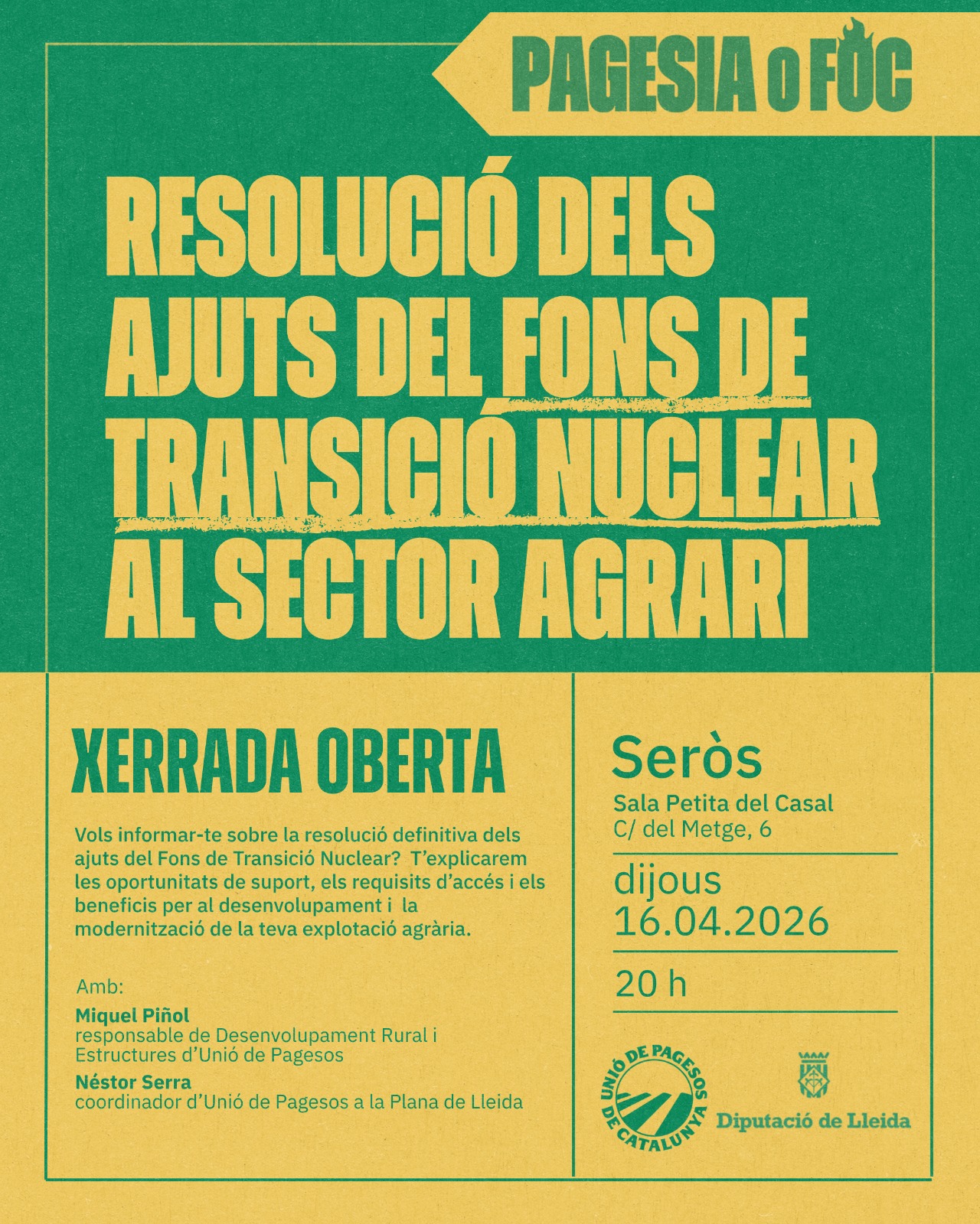 Unió de Pagesos de Catalunya    /    Actualitat    /    Agenda    /    Assemblea informativa oberta sobre la ressolució dels ajuts del fons nuclear – Seròs
