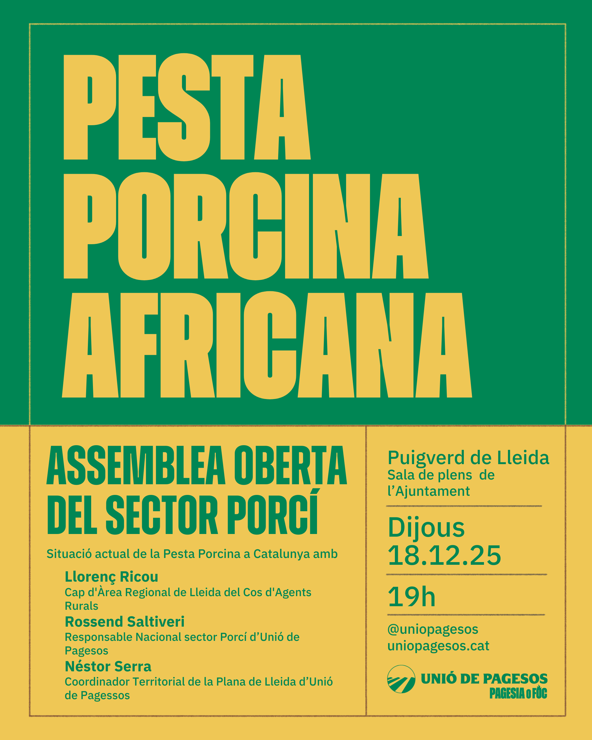 Unió de Pagesos de Catalunya    /    Actualitat    /    Agenda    /    Assemblea oberta Pesta Porcina a Puigverd de Lleida