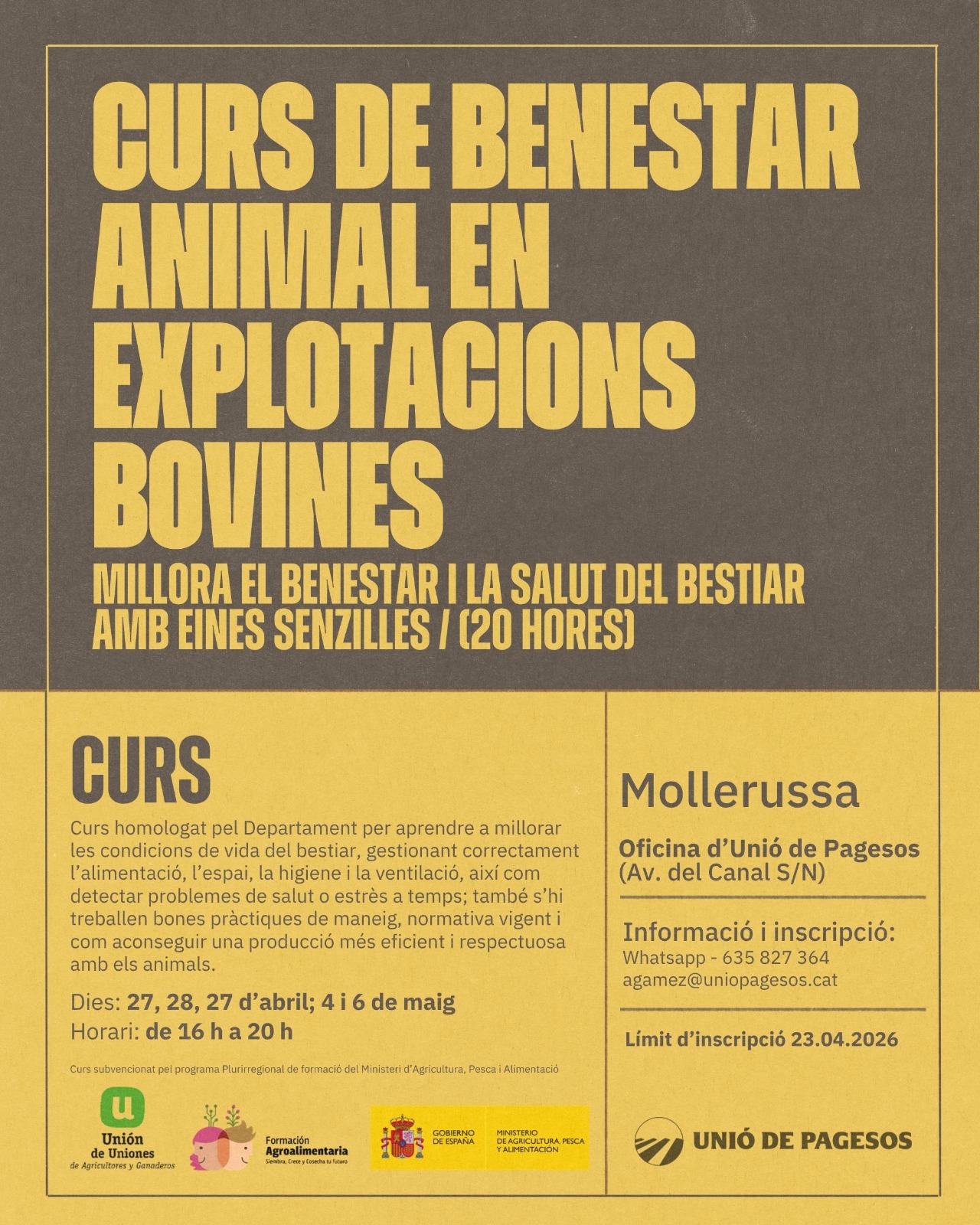 Contacteu amb Alba Gámez. Cal enviar per e-mail agamez@uniopagesos.cat o Whatsapp 635827364