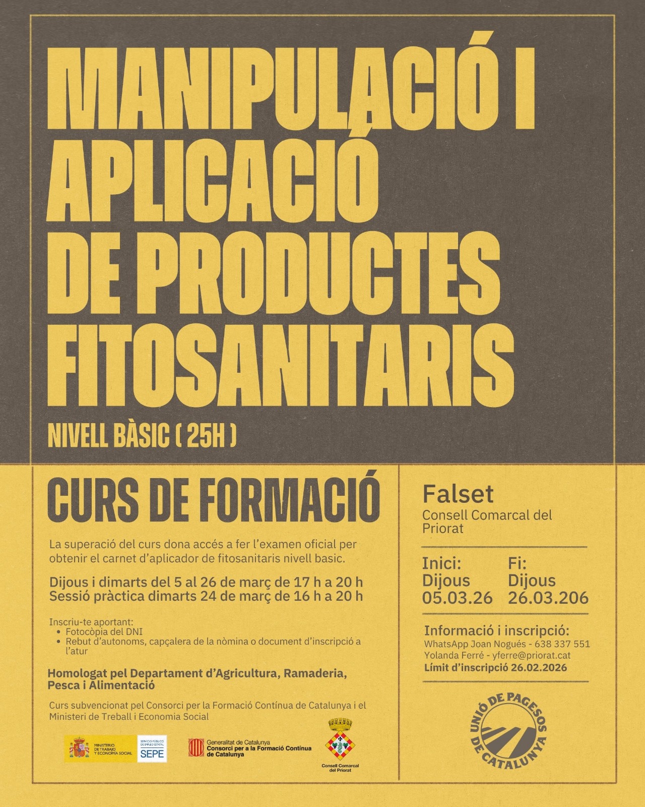 Curs.Manipulador i Aplicador de Fitosanitaris Bàsic (25h). Falset