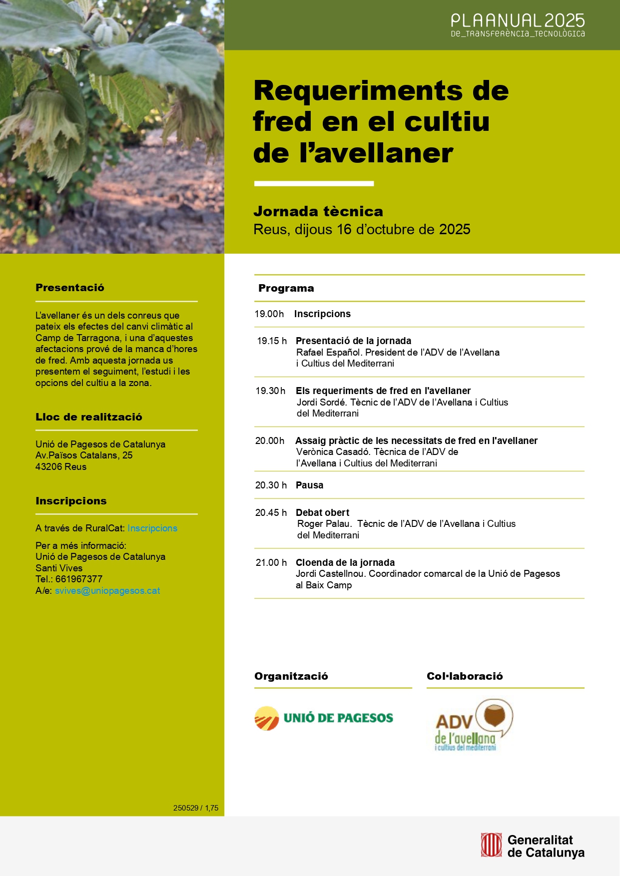 Unió de Pagesos de Catalunya    /    Actualitat    /    Agenda    /    Jornada PATT. Requeriments de fred en el cultiu de l’avellaner_ Reus