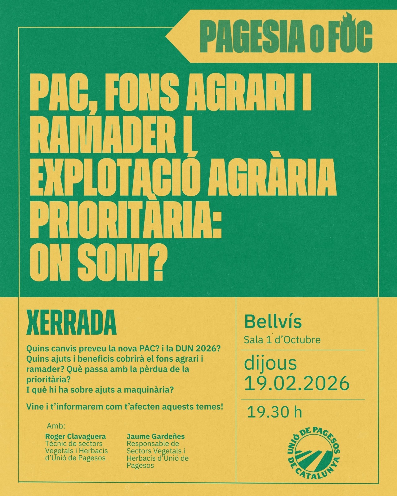 Unió de Pagesos de Catalunya    /    Actualitat    /    Agenda    /    PAC, FONS AGRARI I RAMADER I EXPLOTACIÓ AGRÀRIA PRIORITÀRIA: ON SOM? – BELLVÍS