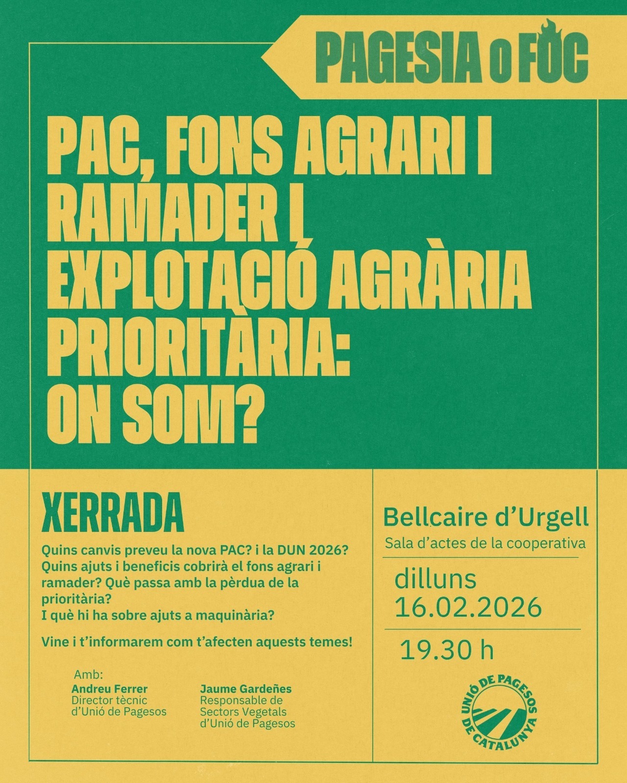 Unió de Pagesos de Catalunya    /    Actualitat    /    Agenda    /    PAC, Fons agrari i ramader i prioritària. On som? – Bellcaire d’Urgell