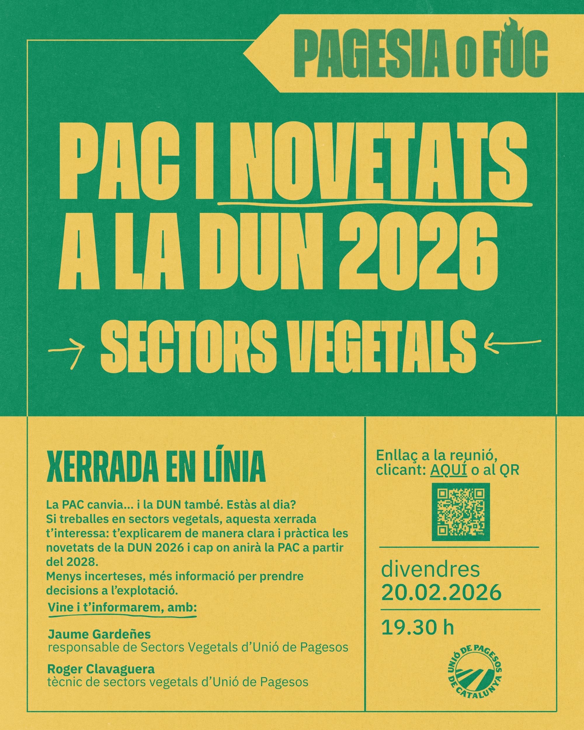 Unió de Pagesos de Catalunya    /    Actualitat    /    Agenda    /    PAC i novetats a la DUN 2026 – sectors vegetals. EN LÍNIA