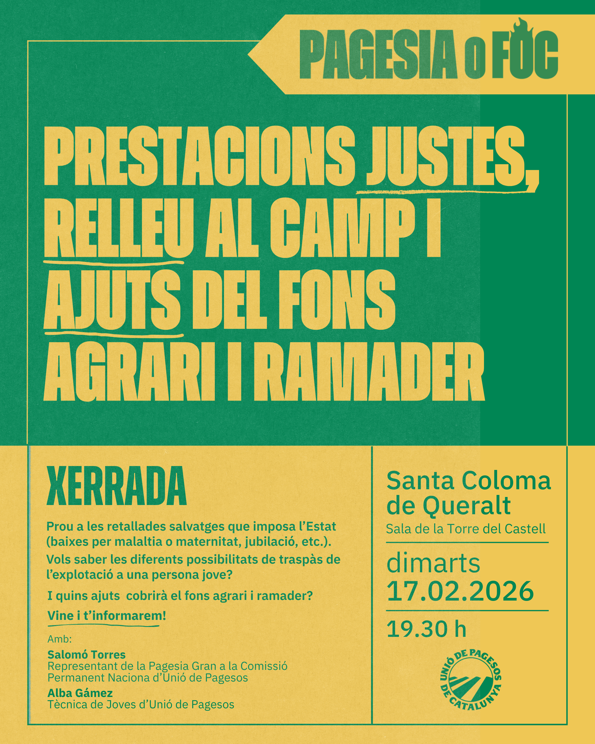 Unió de Pagesos de Catalunya    /    Actualitat    /    Agenda    /    Prestacions justes, relleu al camp i ajuts del fons agrari i ramader – Santa Coloma de Queralt