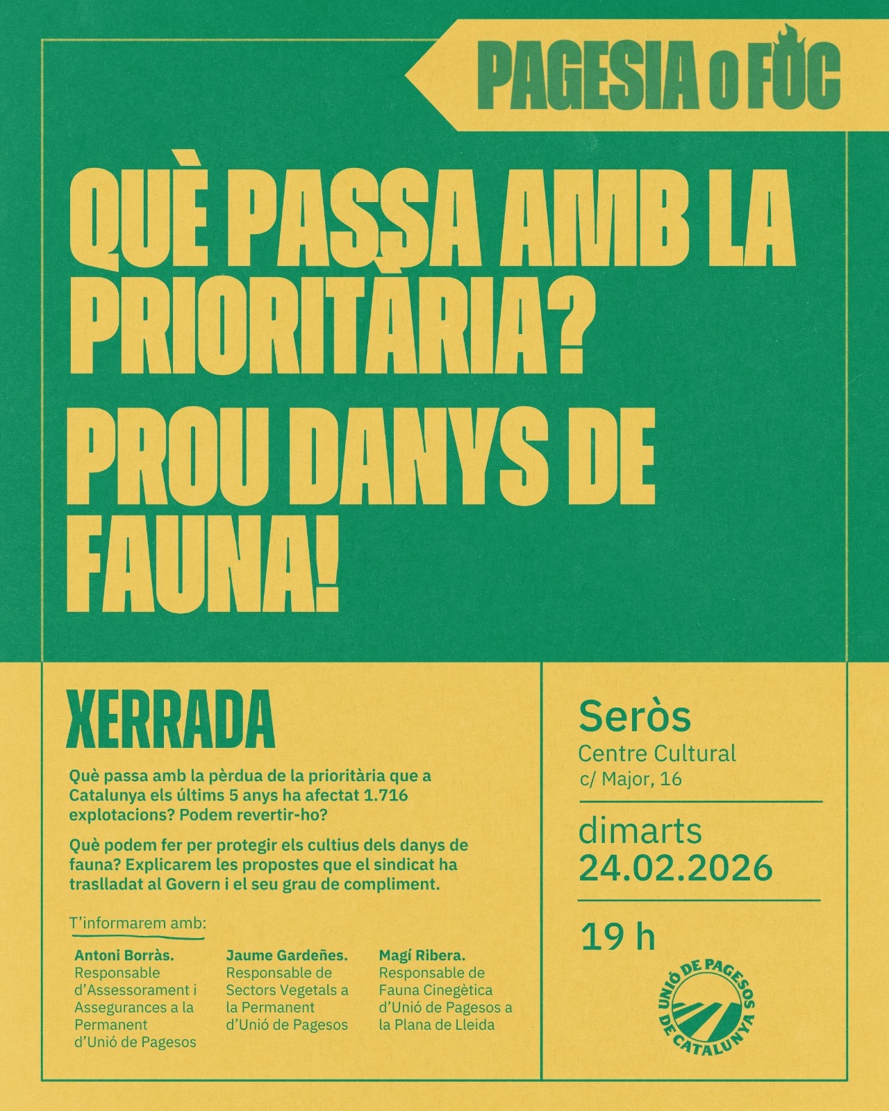 Unió de Pagesos de Catalunya    /    Actualitat    /    Agenda    /    Que passa amb la Prioritària? Prou danys de Fauna. Serós