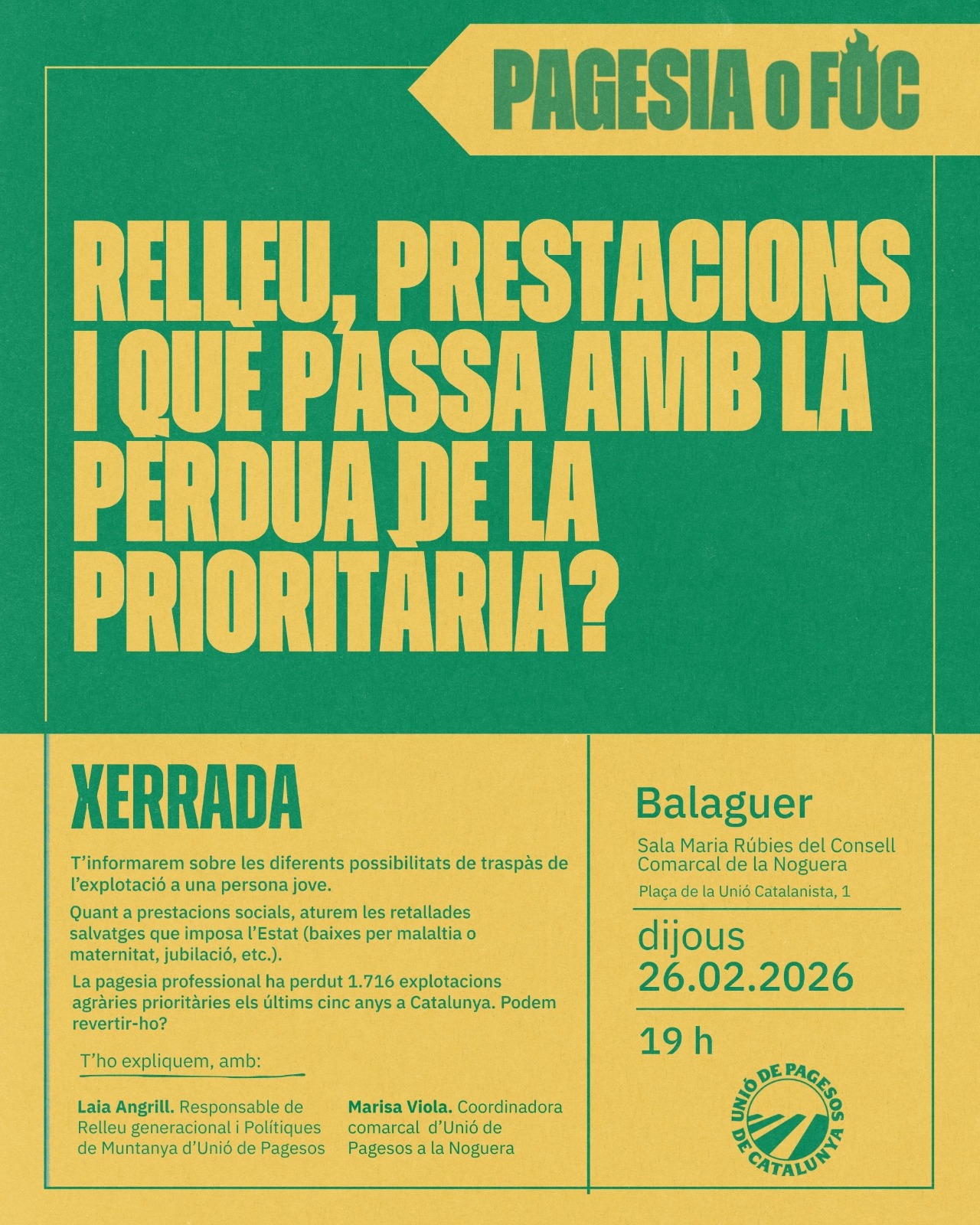 Unió de Pagesos de Catalunya    /    Actualitat    /    Agenda    /    Relleu, prestacions justes i què passa amb la pèrdua de la prioritària? – Balaguer