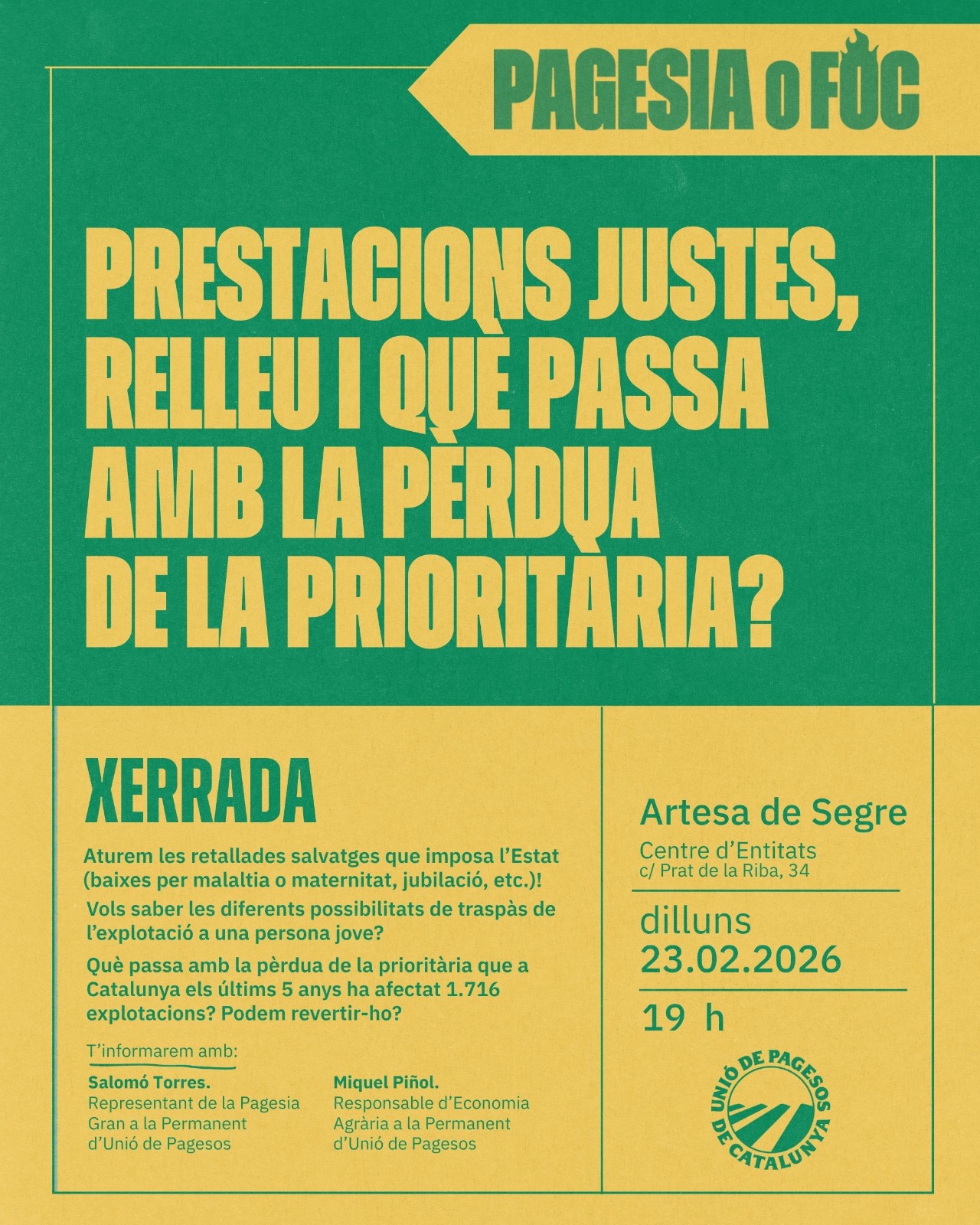 Unió de Pagesos de Catalunya    /    Actualitat    /    Agenda    /    Relleu, prestacions justes i què passa amb la pèrdua de la prioritària? – Artesa de Segre