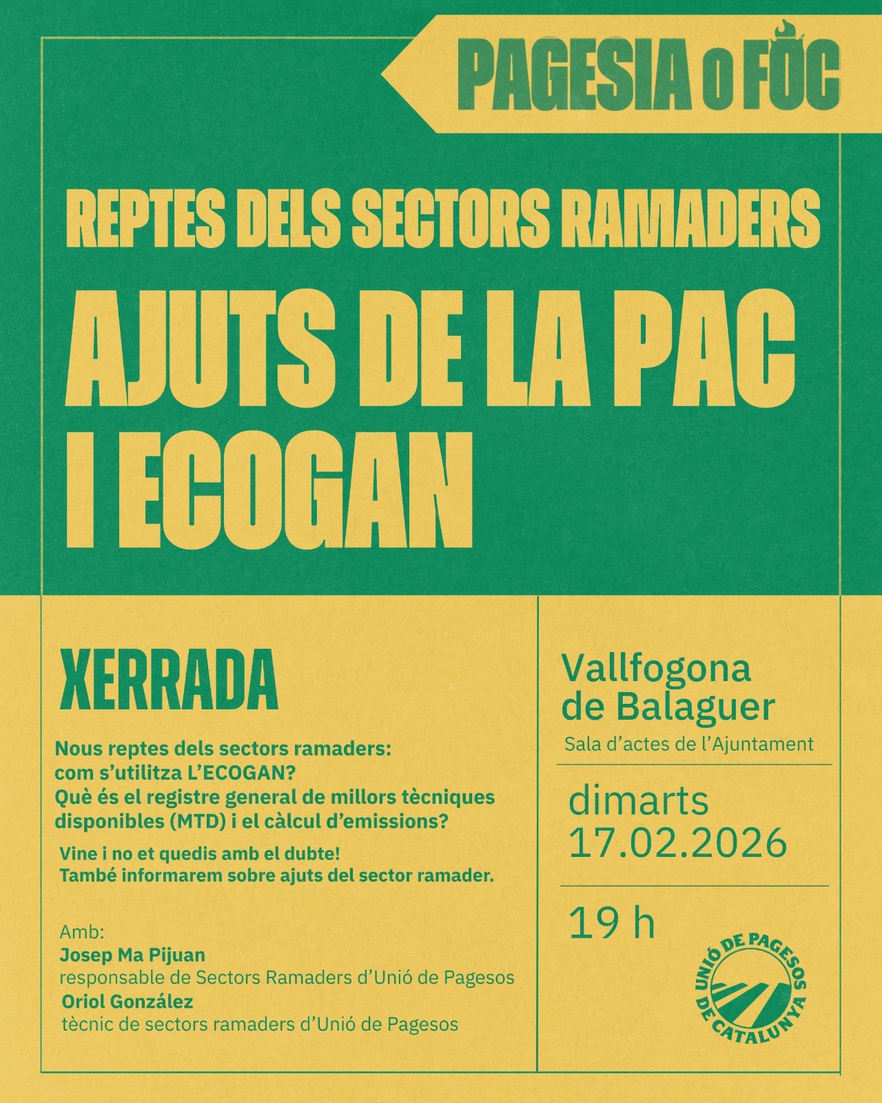 Unió de Pagesos de Catalunya    /    Actualitat    /    Agenda    /    Reptes sectors ramaders. Ajuts de la PAC i ECOGAN – Vallfogona de Balaguer