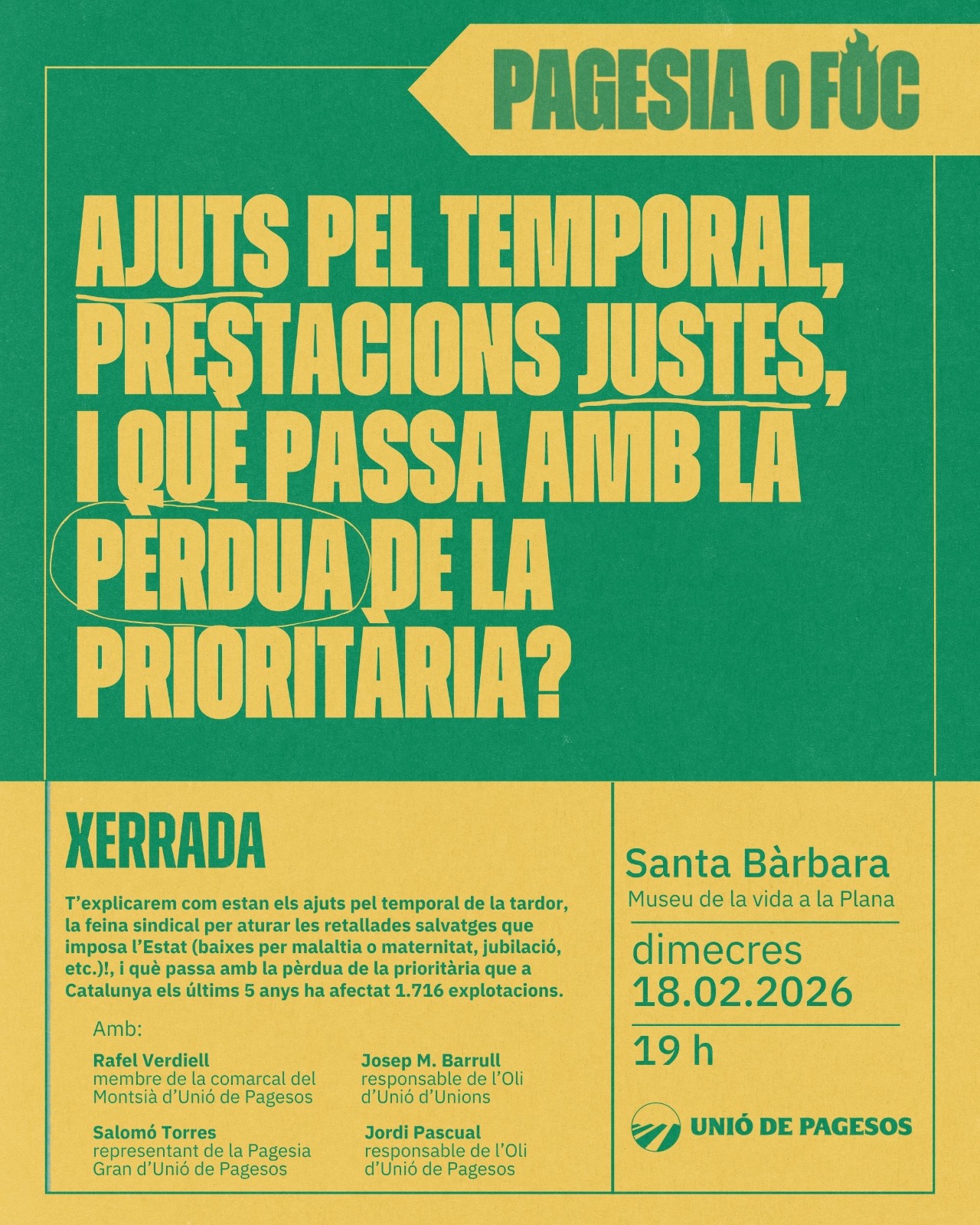 Unió de Pagesos de Catalunya    /    Actualitat    /    Agenda    /    Xerrada. Ajuts pel temporal, Pretacions Justes i què passa amb la perdua de la prioritària? – Santa Bàrbara