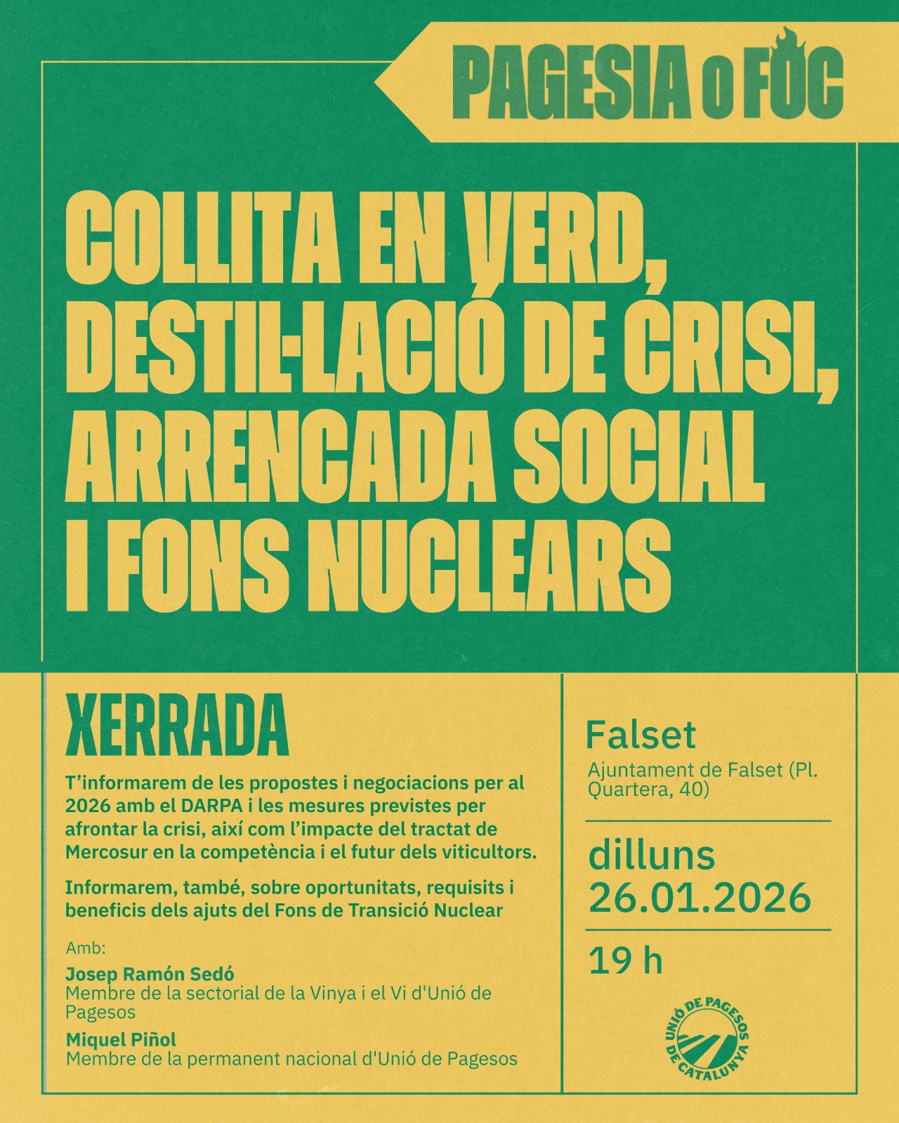 Unió de Pagesos de Catalunya    /    Actualitat    /    Agenda    /    Xerrada. Collita en verd, destil·lació de crisi, arencada social i fons nuclears. Falset