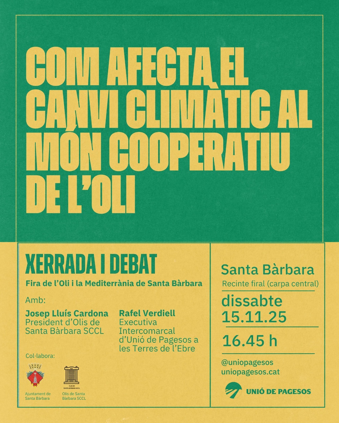 Unió de Pagesos de Catalunya    /    Actualitat    /    Agenda    /    Xerrada. Com afecta el canvi climàtic al món cooperatiu de l’oli. Santa Bàrbara