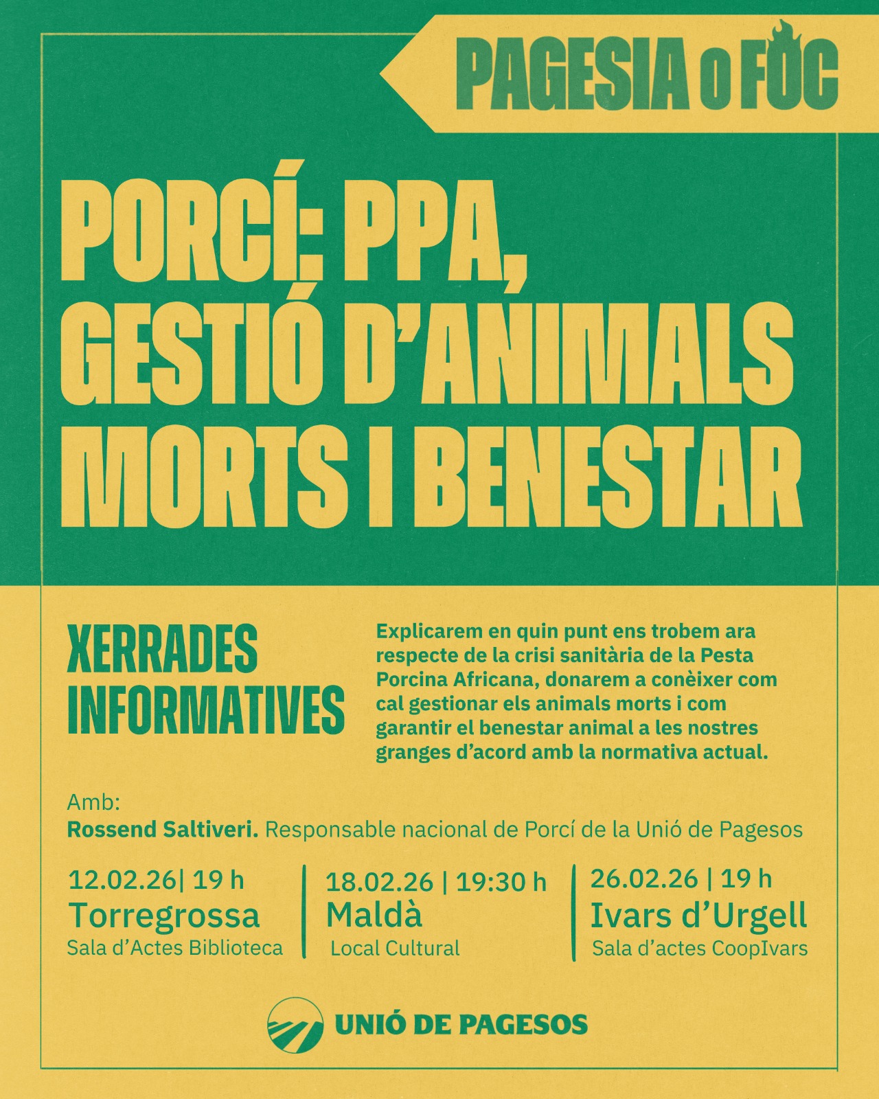Xerrades informatives sector PORCÍ: PPA, GESTIÓ D’ANIMALS MORTS I BENESTAR ANIMAL A TORREGROSSA.