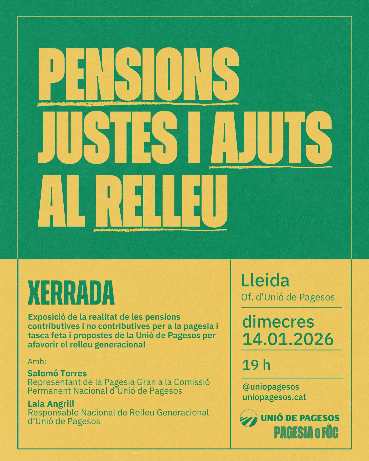 Xerrada informativa sobre les Pensions Justes i els Ajuts al Relleu Generacional. S’exposarà la realitat de les pensions contributives i no contributives per a la pagesia i tasca feta i propostes de la Unió de Pagesos per afavorir el relleu generacional.