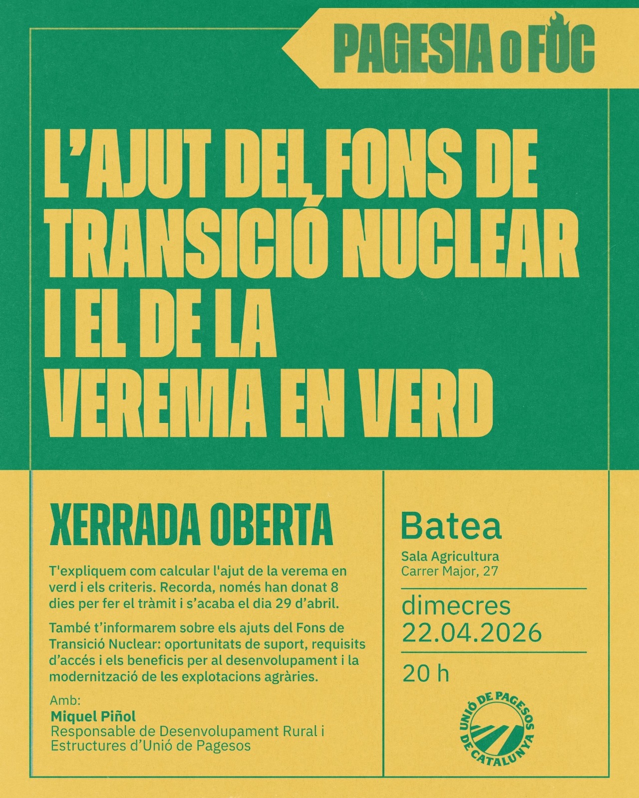 Unió de Pagesos de Catalunya    /    Actualitat    /    Agenda    /    Xerrada. L’ajut del Fons de Transició Nuclear i el de la verema en verd. Batea