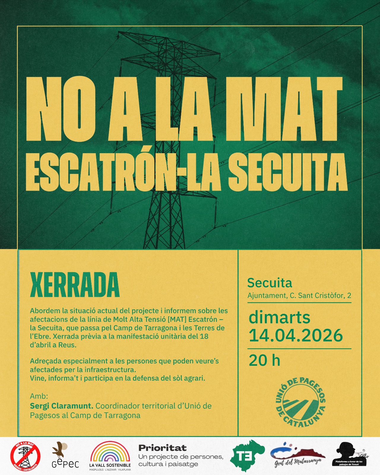 Unió de Pagesos de Catalunya    /    Actualitat    /    Agenda    /    Xerrada. No a la MAT Escatrón- La Secuita– La Secuita