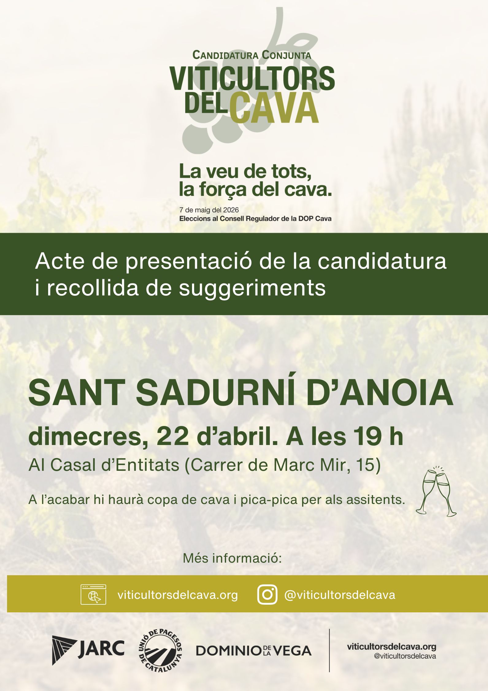 Unió de Pagesos de Catalunya    /    Actualitat    /    Agenda    /    Xerrada. Presentació candidatura Viticultors del Cava (eleccions DOP CAVA). SANT SADURNÍ D’ANOIA