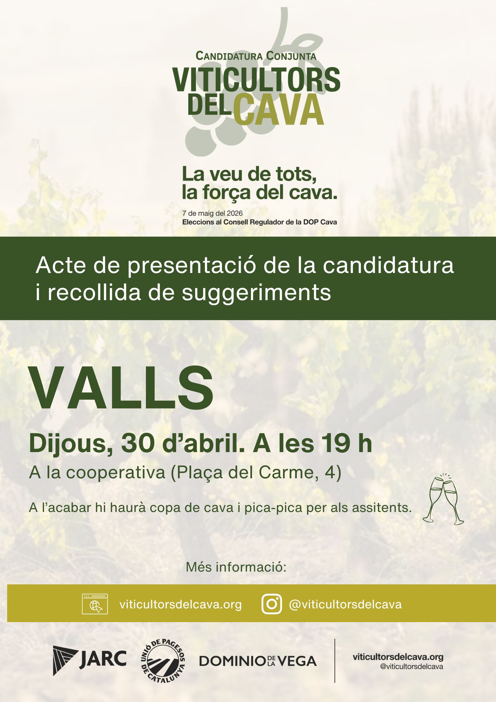 Unió de Pagesos de Catalunya    /    Actualitat    /    Agenda    /    Xerrada. Presentació candidatura Viticultors del Cava (eleccions DOP CAVA). VALLS