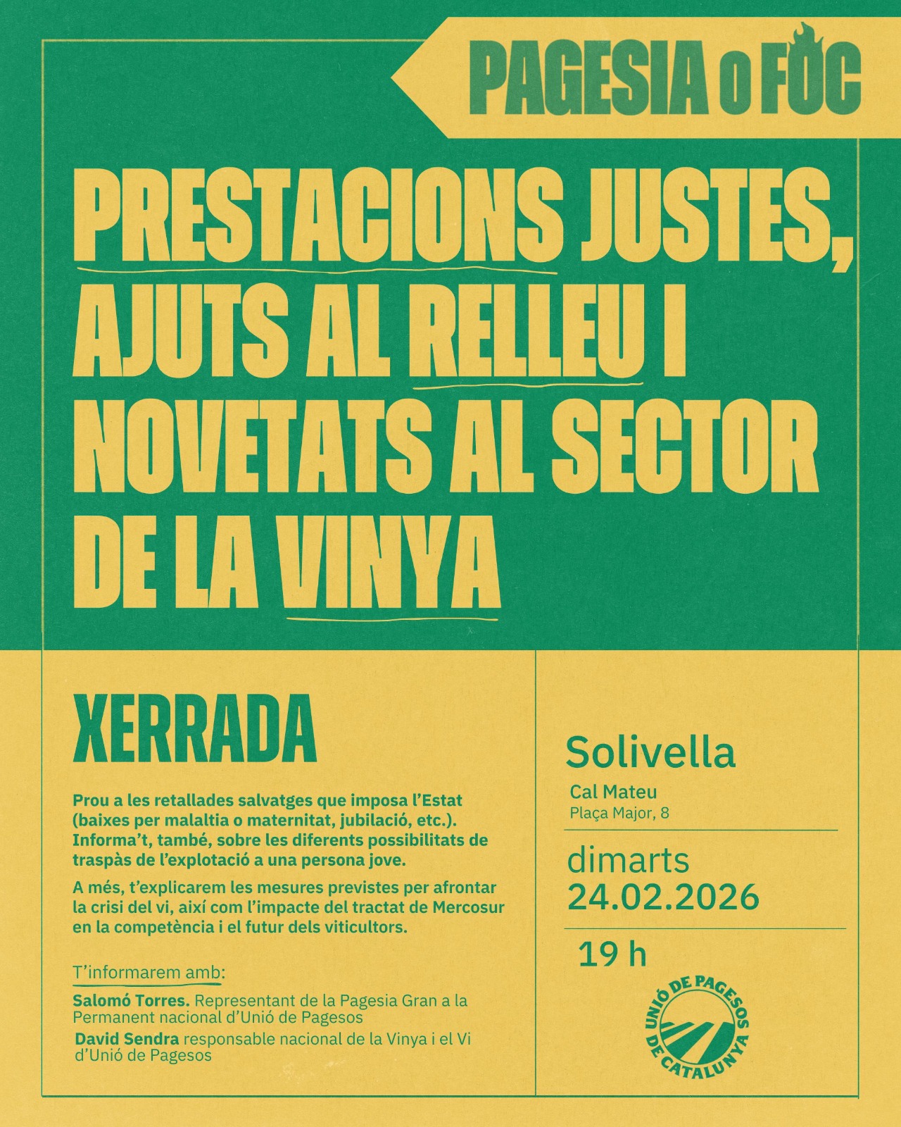 Unió de Pagesos de Catalunya    /    Actualitat    /    Agenda    /    Xerrada- Prestacions justes, ajuts al relleu i novetats al sector de la vinya-Solivella