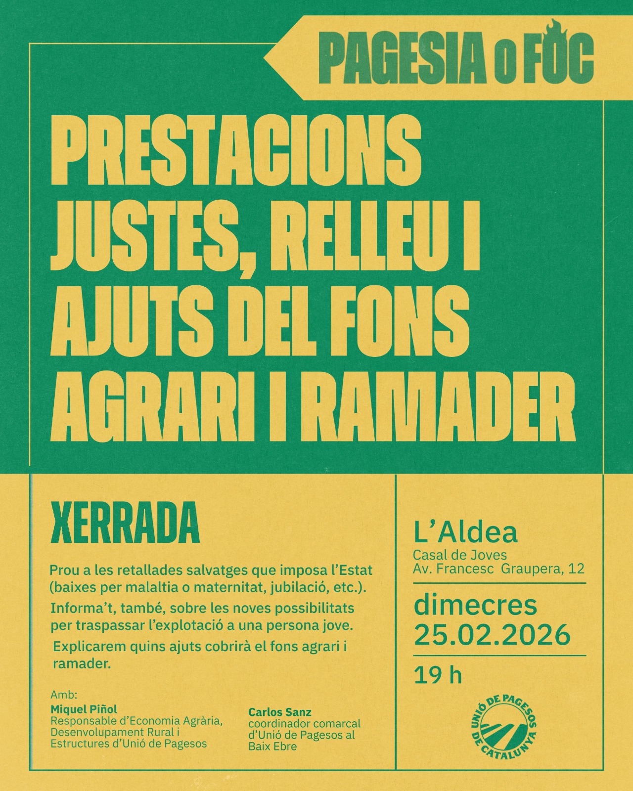 Unió de Pagesos de Catalunya    /    Actualitat    /    Agenda    /    Xerrada. Prestacions justes, relleu i ajuts del fons agrari i ramader. L’Aldea