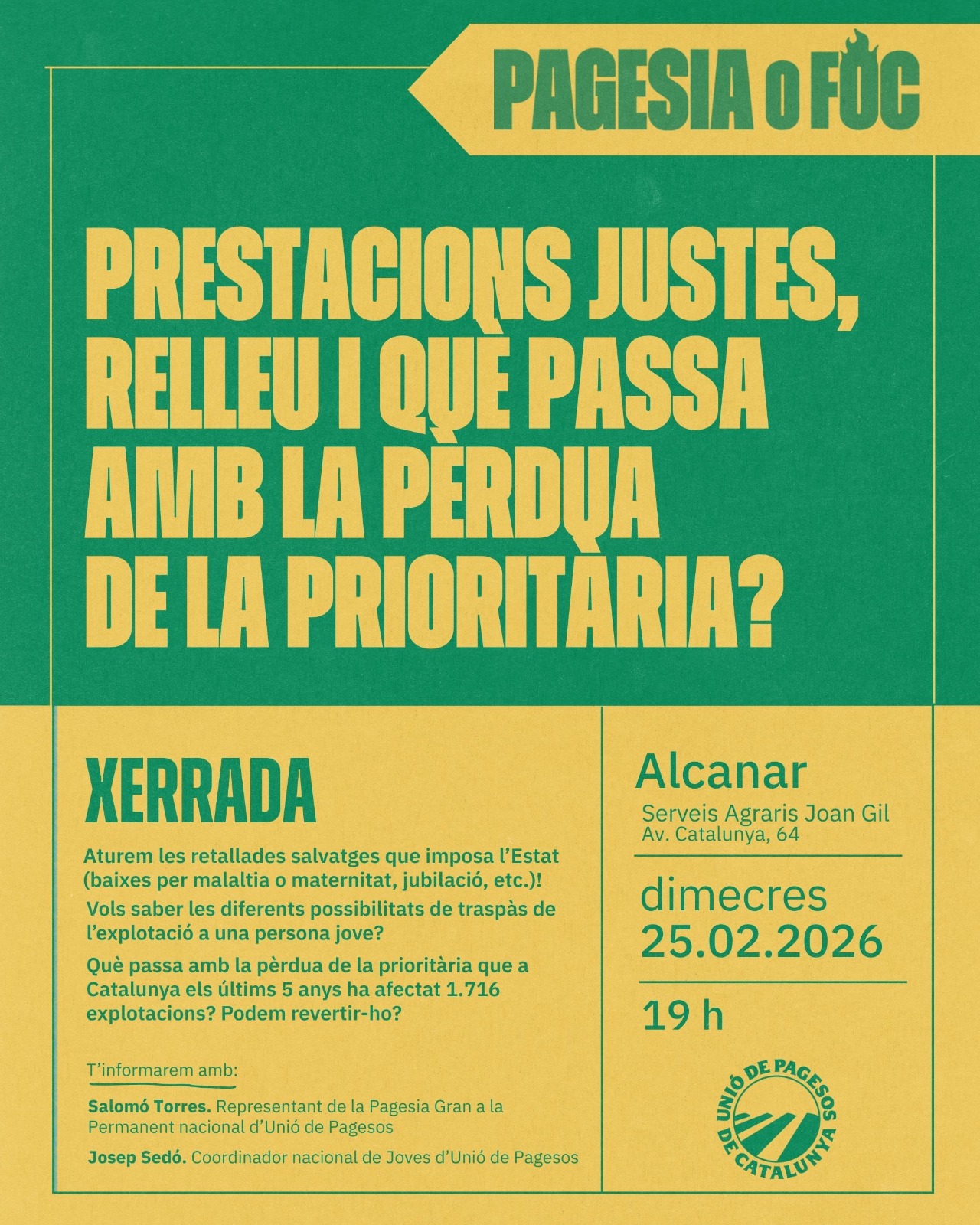 Unió de Pagesos de Catalunya    /    Actualitat    /    Agenda    /    Xerrada. Prestacions justes, relleu i què passa amb la perdua de la prioritària? Alcanar