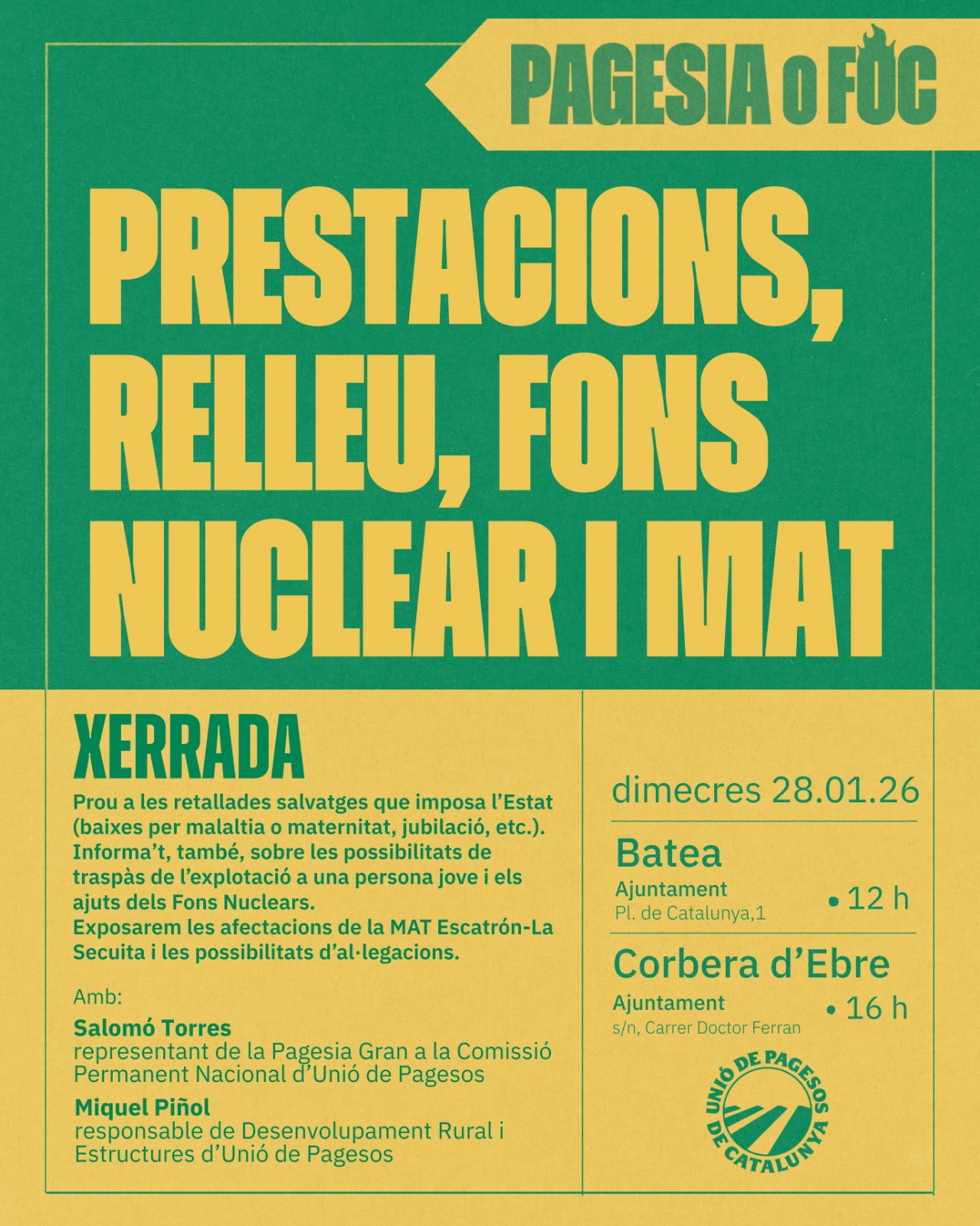Unió de Pagesos de Catalunya    /    Actualitat    /    Agenda    /    Xerrada. Prestacions, relleu, fons nuclear i MAT Escatrón-La Secuita. Corbera d’Ebre