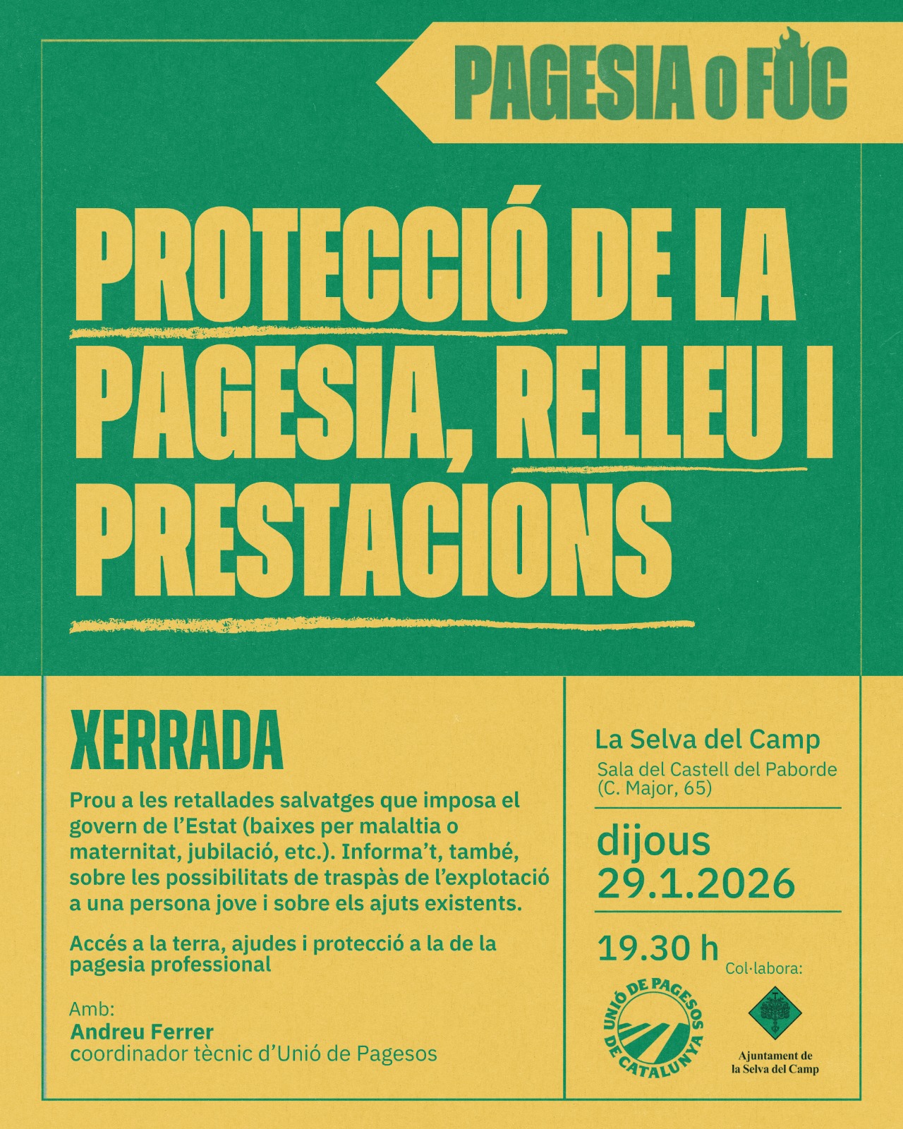 Unió de Pagesos de Catalunya    /    Actualitat    /    Agenda    /    Xerrada. Protecció de la pagesia, relleu i prestacions_ La Selva del Camp