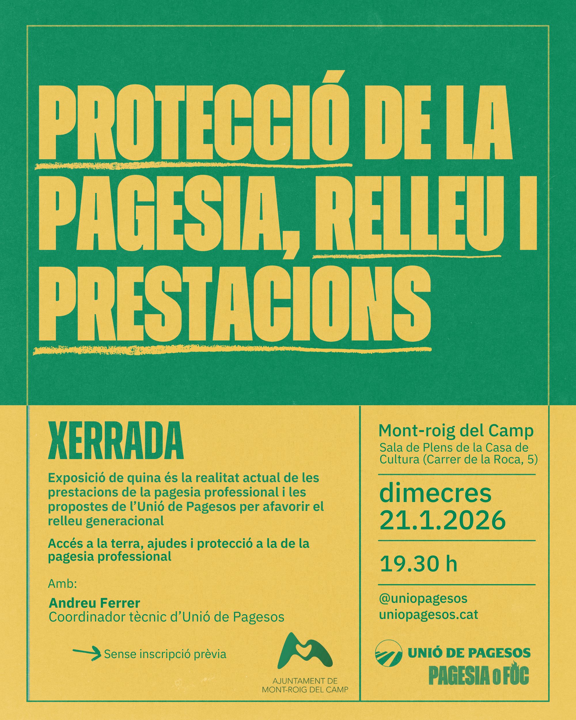 Unió de Pagesos de Catalunya    /    Actualitat    /    Agenda    /    Xerrada. Protecció de la Pagesia, relleu i prestacions_ Mont-roig del Camp