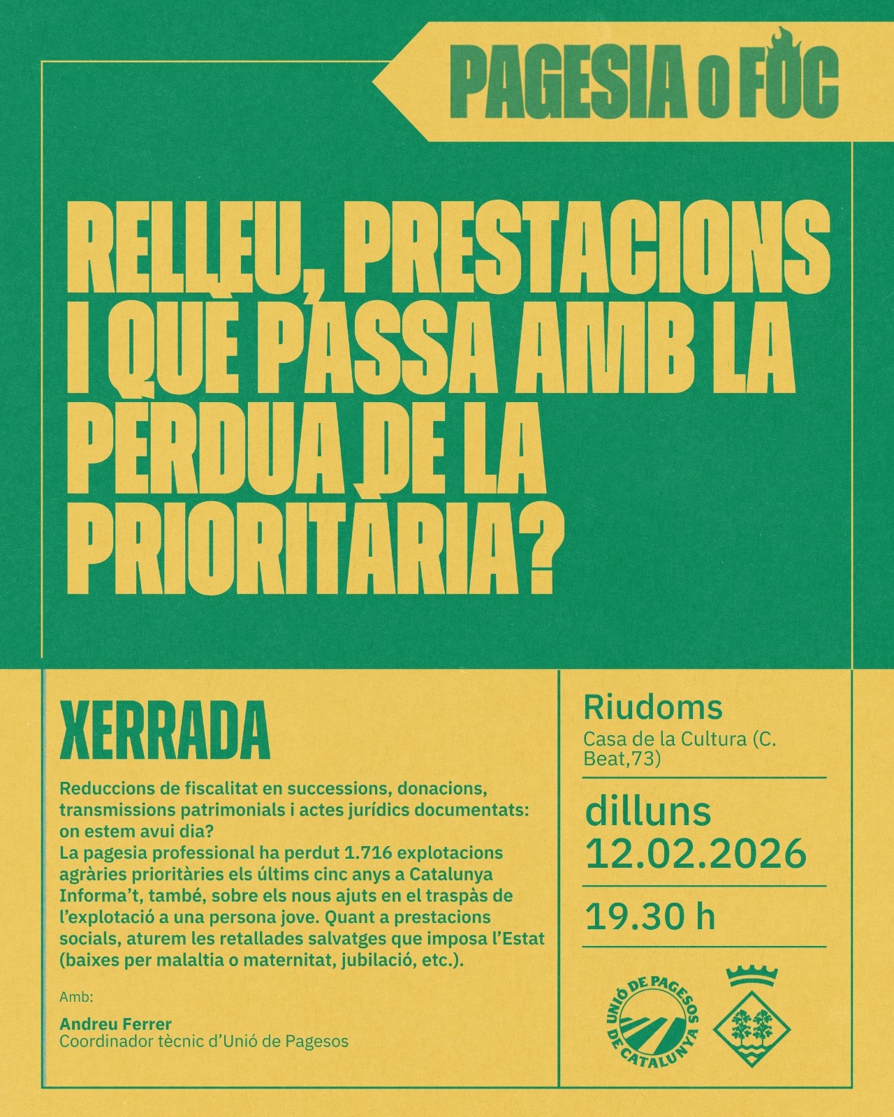 Unió de Pagesos de Catalunya    /    Actualitat    /    Agenda    /    Xerrada. Protecció de la pagesia, relleu i què passa amb la pèrdua de la prioritària? _Riudoms