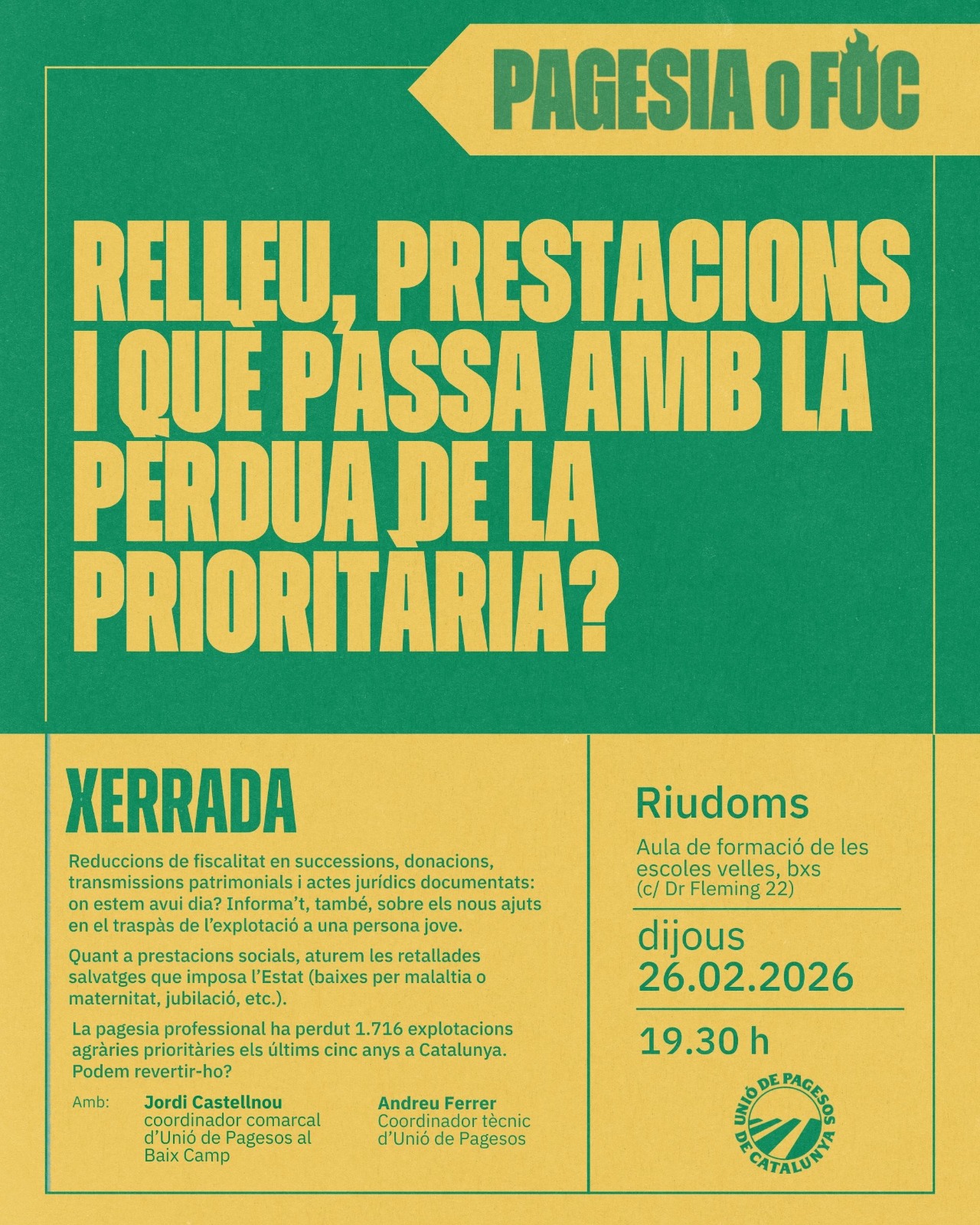 Unió de Pagesos de Catalunya    /    Actualitat    /    Agenda    /    Xerrada. Relleu, prestacions i què passa amb la pèrdua de la prioritària? Riudoms