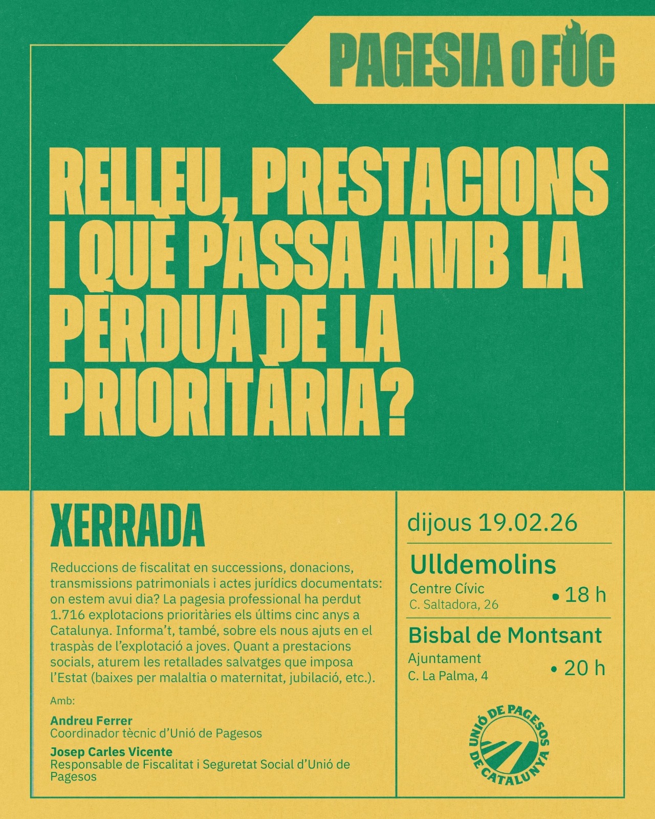Unió de Pagesos de Catalunya    /    Actualitat    /    Agenda    /    Xerrada. Relleu, Prestacions i què passa amb la perdua de la prioritària? ULLDEMOLINS