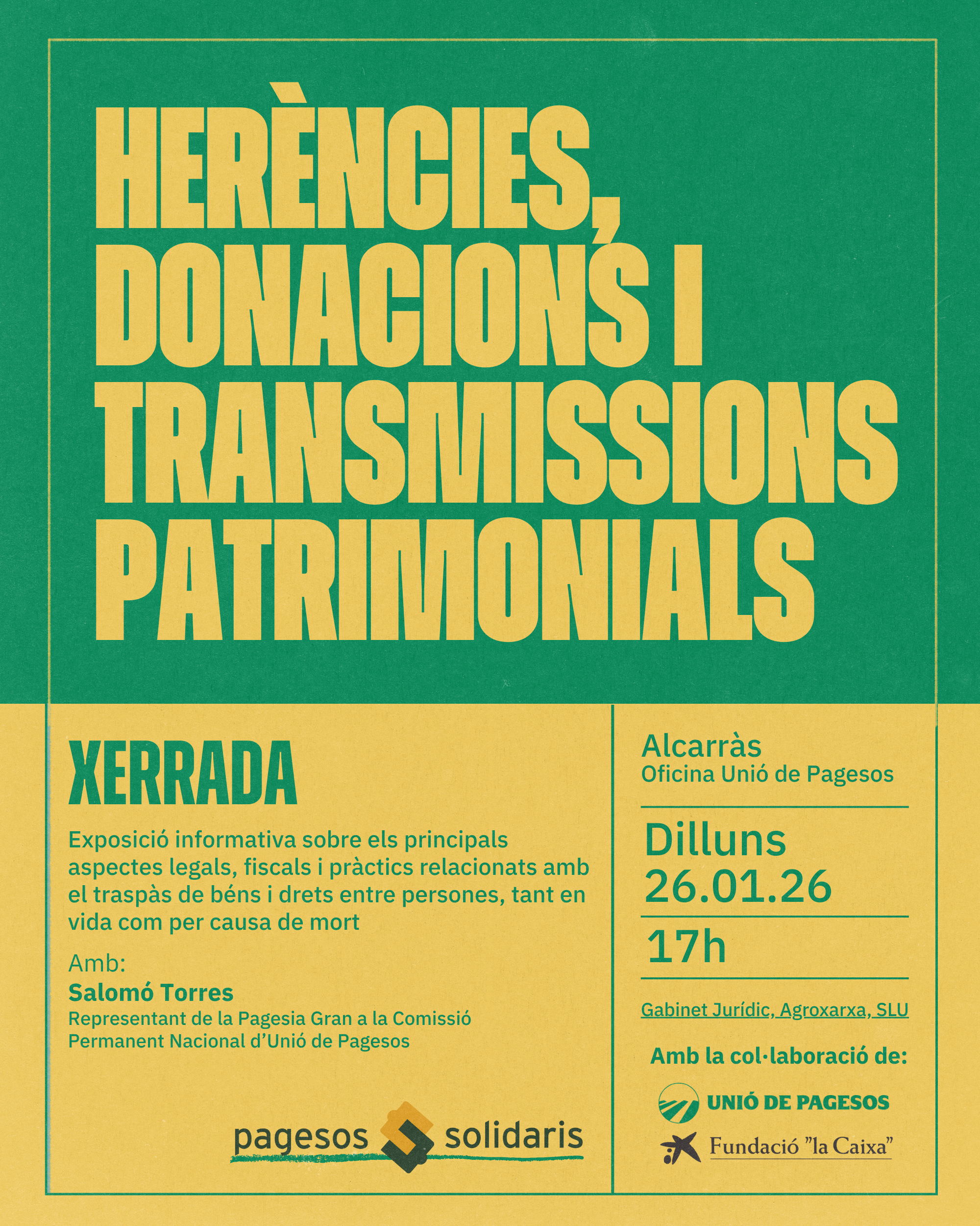 Unió de Pagesos de Catalunya    /    Actualitat    /    Agenda    /    Xerrada sobre Herències, donacions i Transmissions Patrimonials – Alcarràs