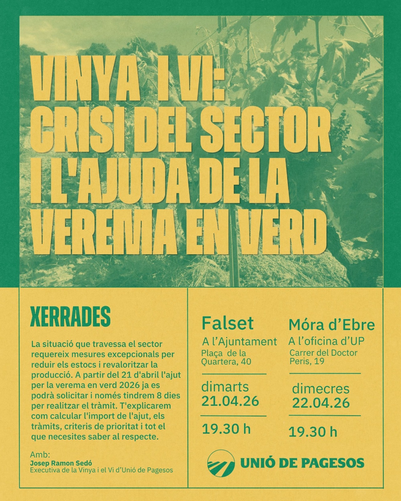 Unió de Pagesos de Catalunya    /    Actualitat    /    Agenda    /    Xerrada. Vinya i Vi: Crisi del sector i l’ajuda de la verema en verd. Falset
