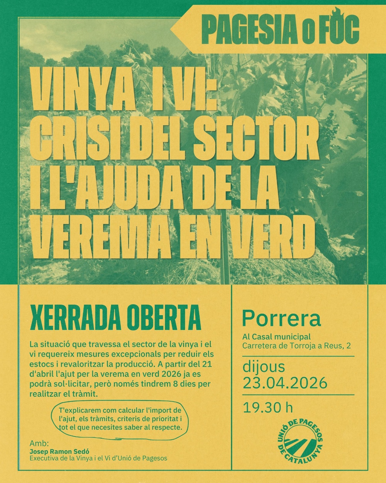 Unió de Pagesos de Catalunya    /    Actualitat    /    Agenda    /    Xerrada. Vinya i vi: Crisi del sector i l’ajuda de la verema en verd. Porrera