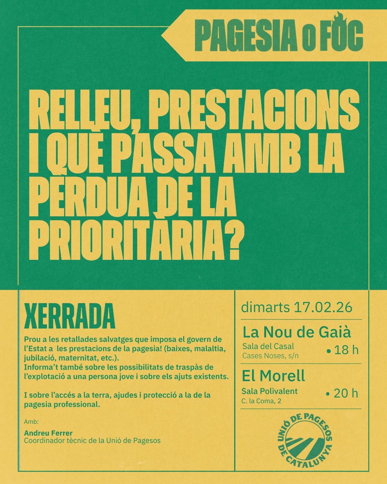 Unió de Pagesos de Catalunya    /    Actualitat    /    Agenda    /    Xerrades. Protecció de la pagesia, relleu i què passa amb la pèrdua de la prioritària?